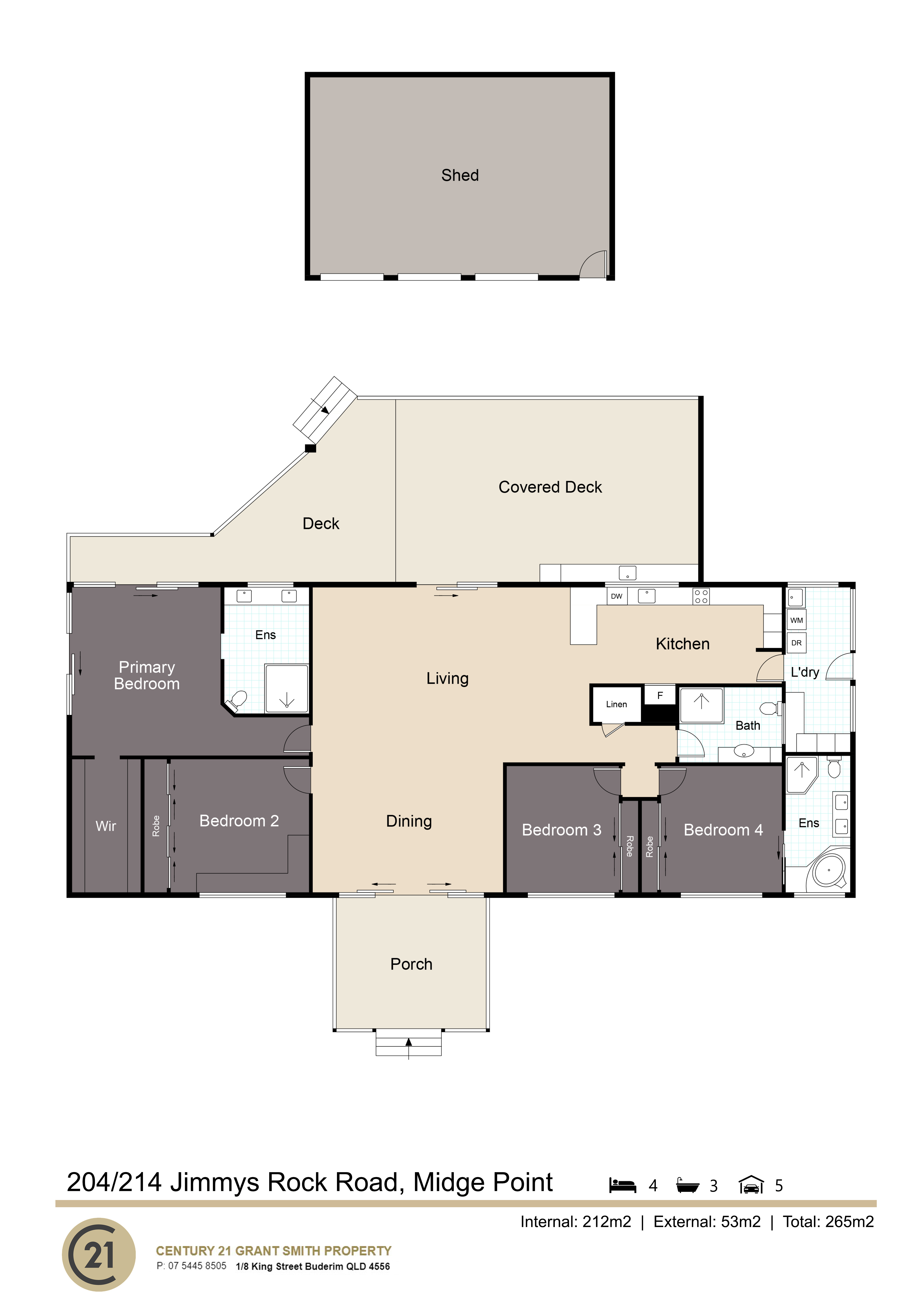 Set across three separate titles with a total land holding of 7,734sqm, the property includes five bedrooms and three bathrooms across the main residence and a separate single-bedroom granny flat. The expansive 12x8m shed, featuring three high clearance roller doors, provides abundant parking or storage.
