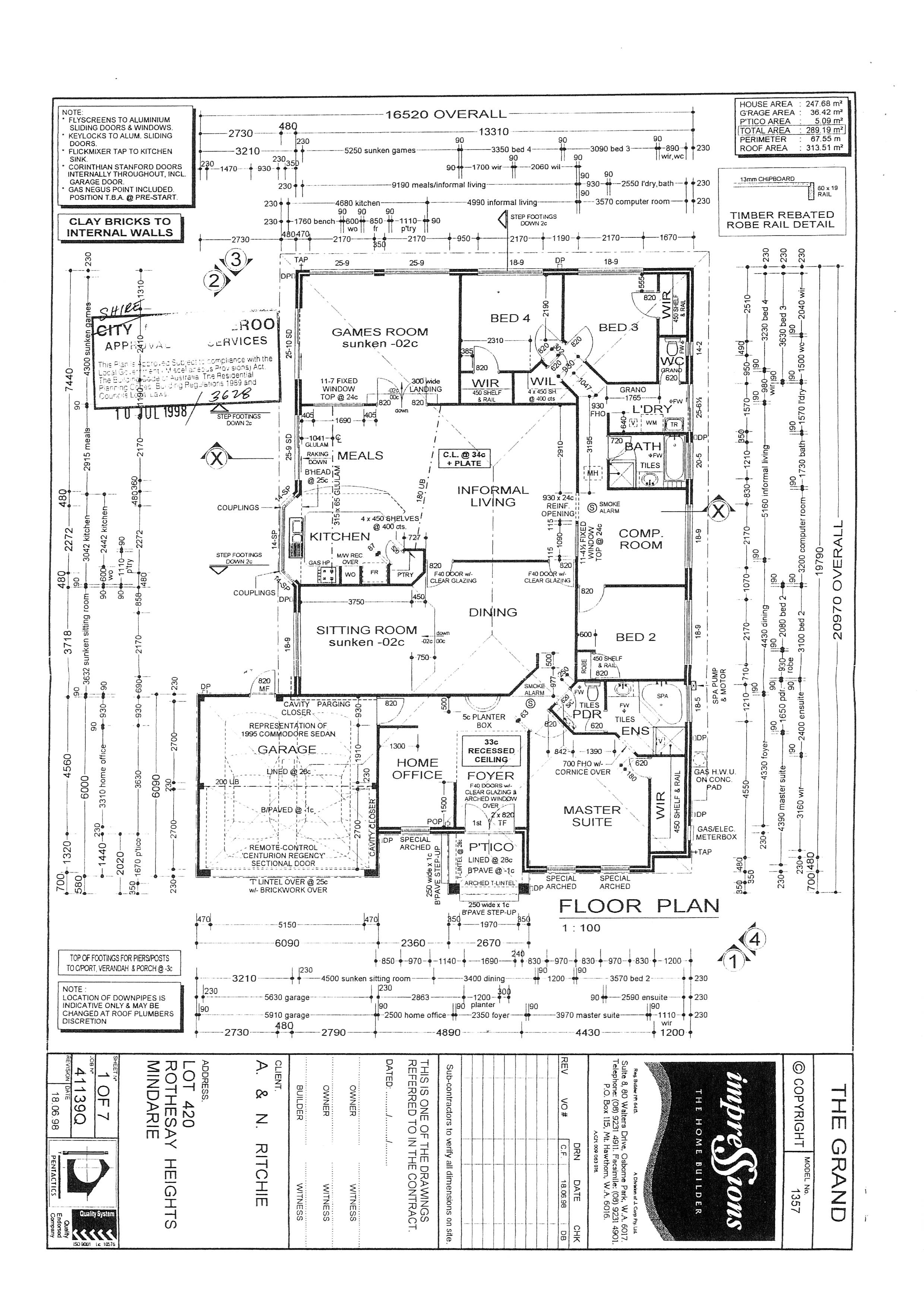 Portico entryDouble doors to entry foyerStudyMaster bedroom inc ceiling fan, WIR and ensuite with double vanityPowder room inc WCDouble doors to theatre inc reverse cycle air-conditioner, projector & screenActivity room inc build in cabinets & shelvesDouble 2nd bedroom inc ceiling fan & BIR2nd bathroomLaundry inc built in bench with stone top2nd WCWalk in linenDouble 3rd bedroom inc ceiling fan & WIRDouble 4th bedroom inc ceiling fan & WIROpen kitchen, dining and family inc reverse cycle air-conditioner and gas pointKitchen inc walk in pantry, fridge recess, integrated s/s microwave, s/s electric oven, 5 burner s/s gas cook top, s/s dishwasher, s/s double sink, breakfast bar, overhead cupboard, stone tops and stone splashbackDouble doors to games roomDouble garage inc remote door and shoppers entryWrap around patio over paved outdoor entertaining areaGas storage hot water systemBelow ground poolLandscaped and paved gardenBuilt 1999 by Impressions on 698sqm