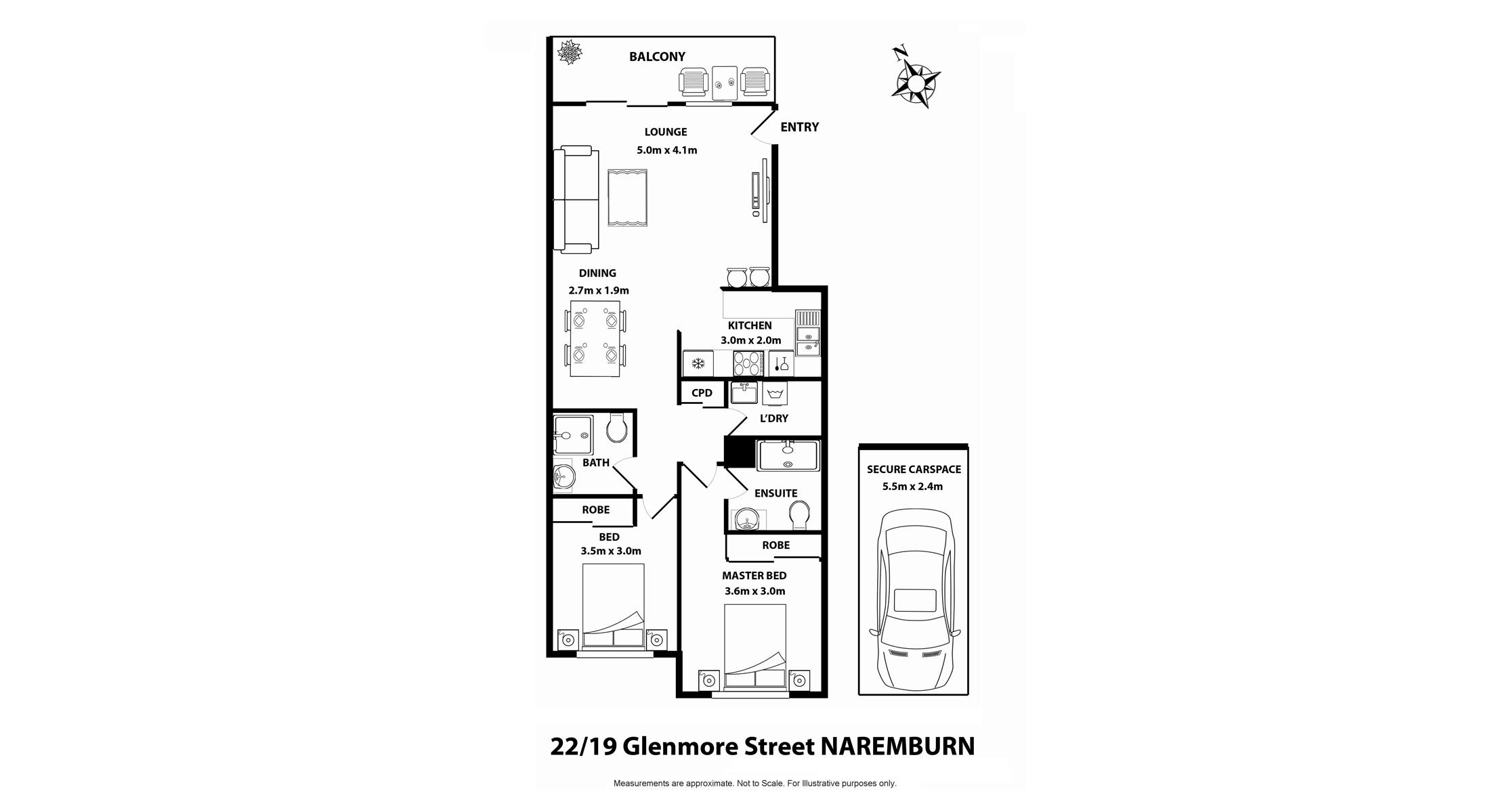 Open plan living and dining flowing out to balconyKitchen with dishwasher and plenty of storage spaceTwo spacious bedrooms with built-in wardrobesTidy main bathroom plus ensuite with bath Split system AC in loungeInternal laundry Secure car space