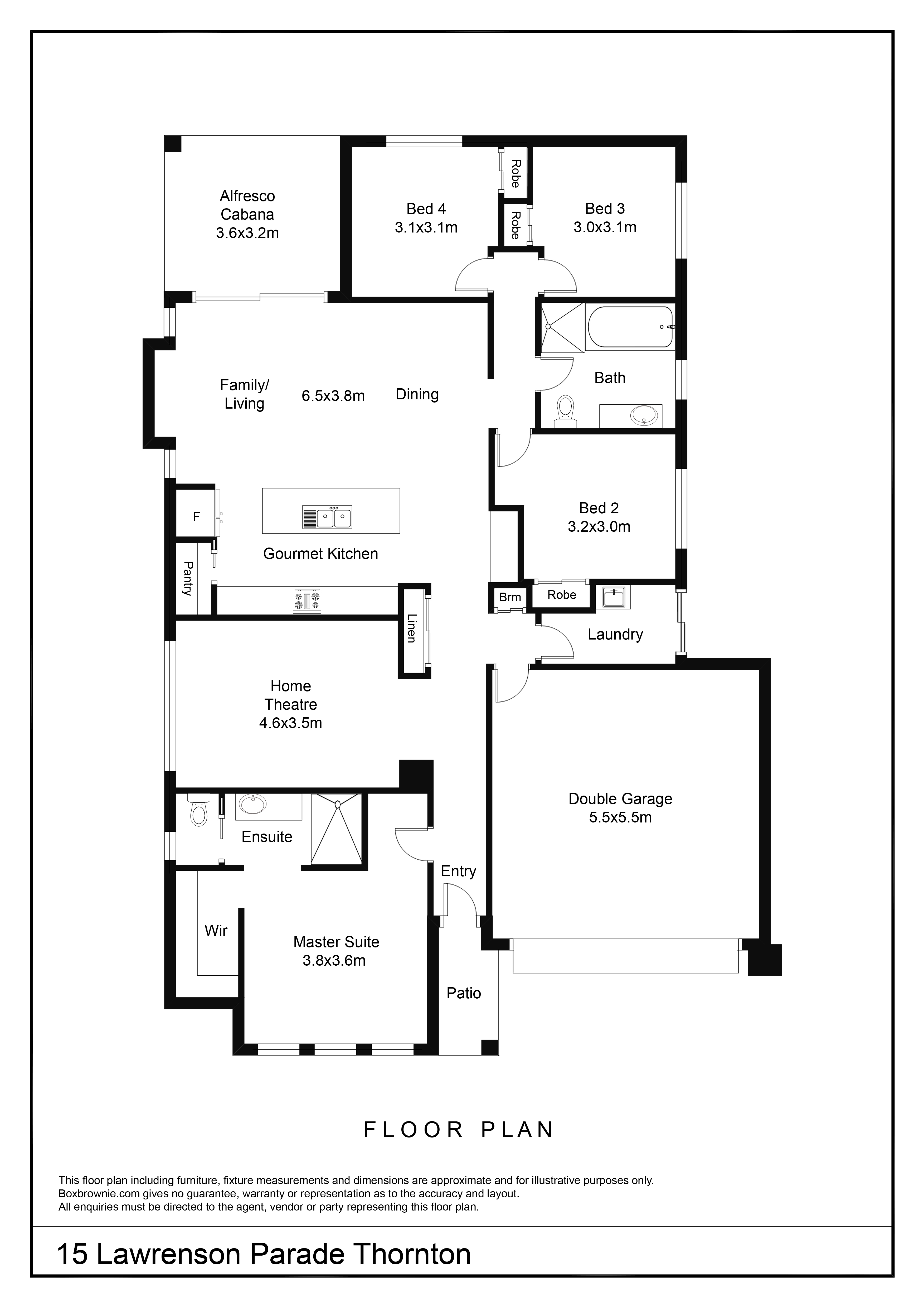 4 spacious carpeted bedrooms Main bedroom with large walk-in robe and ensuite with separate toiletMedia room Gourmet kitchen with dishwasher, 5 burner gas cooktop and electric oven.Combined living/dining areaStudy nookSpacious main bathroom with separate bath and showerFloating floor boards throughoutDucted air conditioning for comfort year-roundAlfresco areaFully fenced yardDouble garage